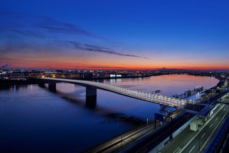The task of building this bridge was completed at unprecedented speed, taking only 8 years to plan, design and construct. Its design gives utmost consideration to the abundant nature at the mouth of the Tama River, striking a fine balance between ease of maintenance and the ability to blend in with the surroundings. It has the longest central span of any composite rigid-frame bridge in Japan at 240 meters, yet manages to maintain an unparalleled beauty by keeping its overall height below 7 meters.