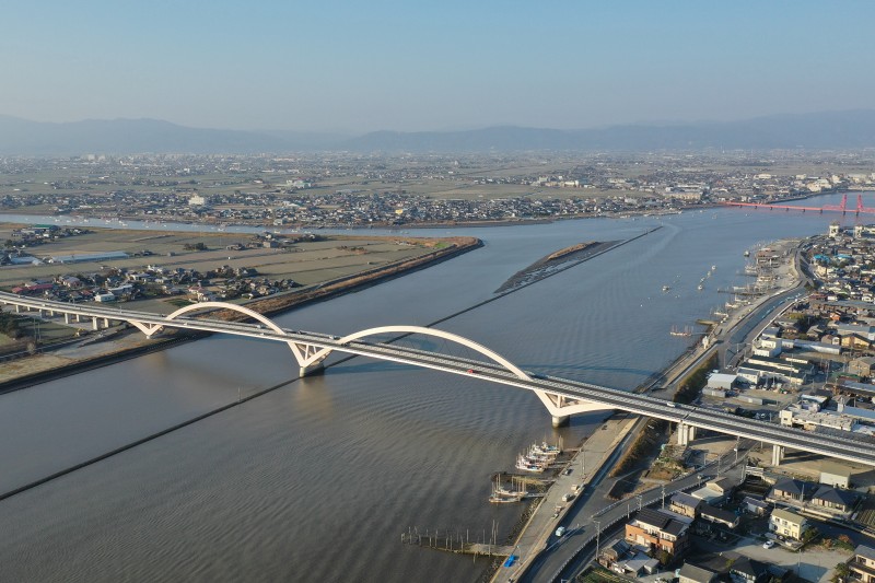 Ariake Chikugo River Bridge is a steel continuous single arch with a maximum span of 170m and a bridge length of 450m as a new form in Japan.