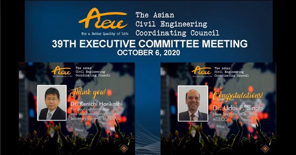 The Executive Committee Meeting (ECM), the highest-level decision-making body of the ACECC, is held twice a year in ACECC members on a rotating basis. This 39th Executive Committee Meeting was held in the form of an online conference from October 5 to October 7, 2020, organized by the Philippine Institute of Civil Engineers (PICE). This article describes the main matters that were discussed and reported at the Technical Coordination Committee Meeting (TCCM) and the Planning Committee Meeting (PCM) and approved at the ECM.