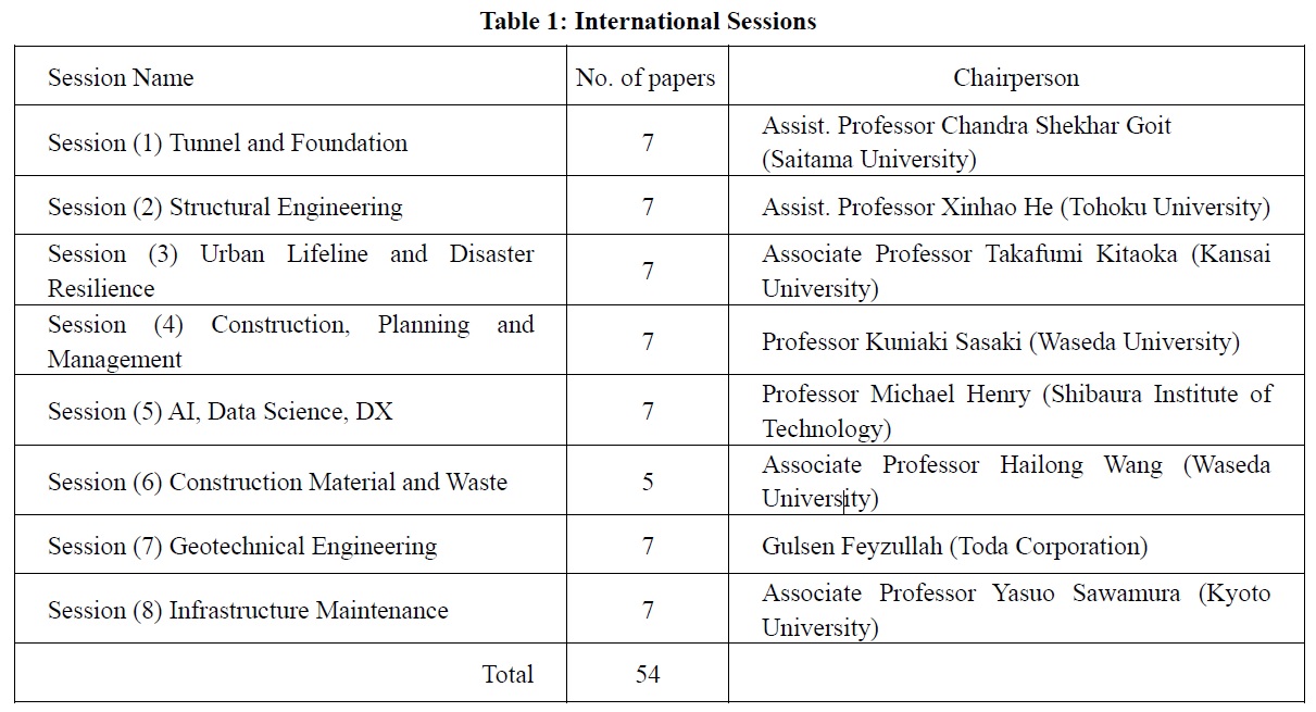 In the International Sessions (Table 1) from September 14th to 15th, 54 papers were presented across a wide range of fields such as tunnel engineering, geotechnical engineering, structural engineering, disaster prevention and resilience, AI and data science, the environment and materials, infrastructure maintenance, etc. The theme of the JSCE Annual Meeting this year was “Appropriate Population Distribution and Resource Allocation,” and by linking both campuses of the Hiroshima University and the Hiroshima Institute of Technology via Zoom, the sessions were held in a whole new format that also enabled presenters to present their research remotely. The sessions, which saw passionate discussions and Q&As span across two days, were full of energy and proved to be a big success. I would like to take this opportunity to express my sincere gratitude to the chairperson, the speakers, and the attendees.