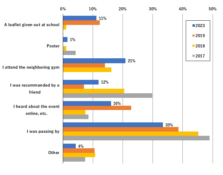 As for how they came to attend the event, the most common answer from visitors was, as in past years, “I was passing by.” This was followed by “I attend the neighboring gym” and “I heard about the event online, etc.”, which were more common answers this year. The percentage of visitors as a result of promotional activities such as handing out flyers at elementary schools nearby and posting information on JSCE’s social media accounts rose to close to 30% overall, showing that the hard work of these promotional activities paid off.