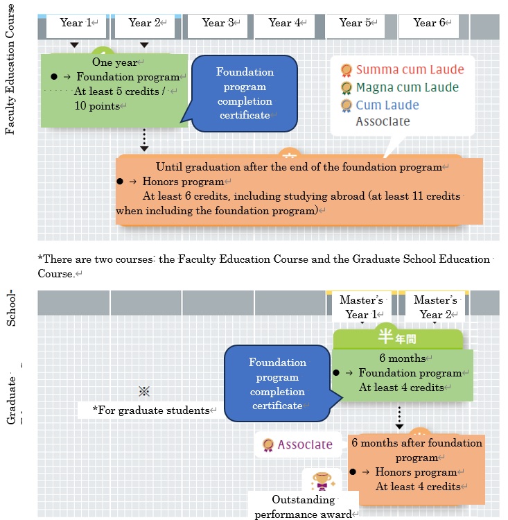 Nitobe College offers a foundation program for both the Faculty Education Course and the Graduate School Education Course (graduate school admissions in the 2022 academic year: 77 (33 of which were international students)) and an honors program (graduate school admissions in the 2022 academic year: 32 (12 of which were international students)). The screening of admitted students is done according to their language capabilities and an issue report assessment. The honors program can be taken by individuals who complete the foundation program and demonstrate outstanding performance (a scholarship system is available, including for studying overseas). In the 2019 academic year, the faculty and graduate school were integrated into the six-year program that exists today. In the academic years 2020 and 2021, the number of international students enrolled in the Graduate School Education Course fell due to the COVID-19 pandemic, but this number bounced back in the 2022 academic year.